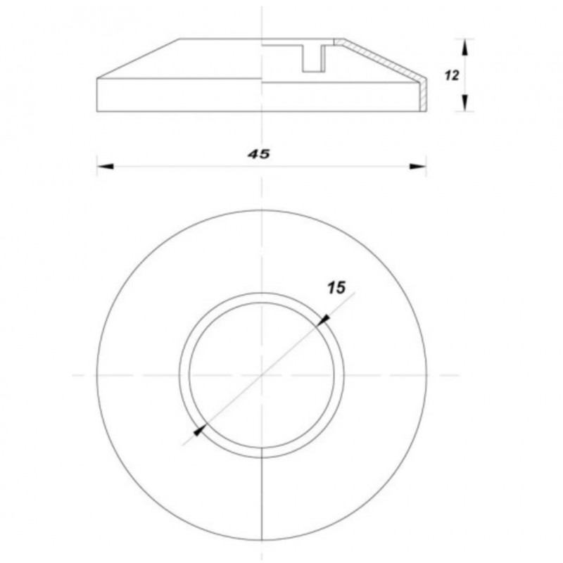 Średnica zewnętrzna rozetki wynosi 45 mm, wewnętrzna to 15 mm, a średnica wewnętrzna to 12 mm, co sprawia, że idealnie pasuje do standardowych rur miedzianych o średnicy 15 mm. Dzięki temu montaż jest prosty i szybki, a efekt końcowy jest estetyczny i schludny.