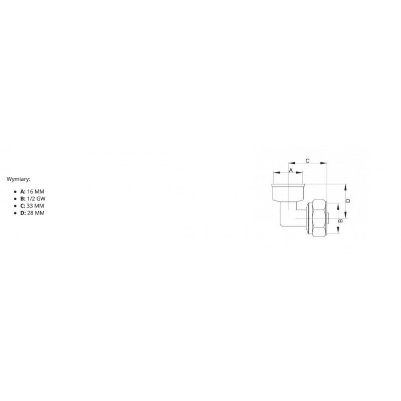 Produkt ten ma wymiary 16 mm średnicy oraz 1/2 cala gwintu i jest kompatybilny z rurami pex, które są coraz częściej wykorzystywane w instalacjach hydraulicznych. Dzięki zastosowaniu gwintu na końcu kolana, złączka może być użyta do połączenia rur o różnej średnicy lub przekroju.