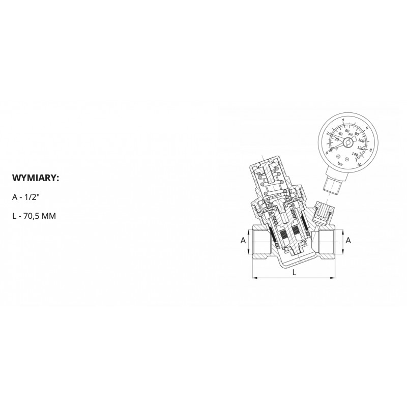 Konstrukcja reduktora oparta jest na solidnym mosiądzu, co gwarantuje trwałość oraz dostosowanie do wymagań dotyczących wody pitnej. Zestaw zawiera również ciśnieniomierz, umożliwiający bieżący monitoring ciśnienia w instalacji.