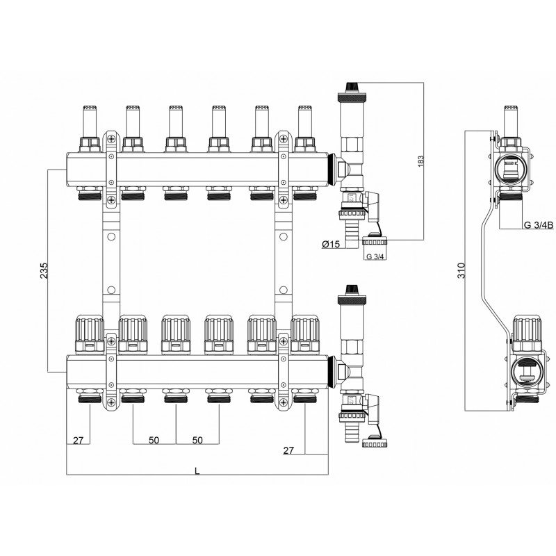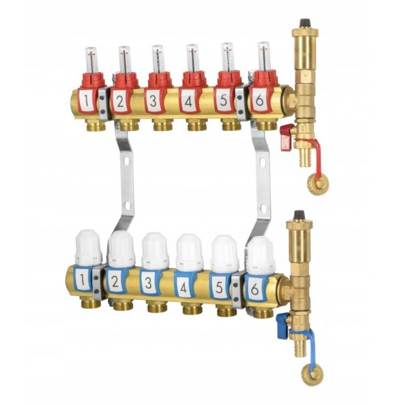 Zestaw rozdzielacza z mosiądzu, dedykowany do systemów ogrzewania podłogowego w budynkach, to kompleksowe rozwiązanie dla efektywnego i wygodnego ogrzewania. Wyposażony w łączniki instalacyjne, zawór odpowietrzający C.O. DN15-P, kurek kulowy spustowy C.O. DN-15P oraz zawór termostatyczny bez głowicy DN15-K, zapewniający precyzyjną kontrolę temperatury.